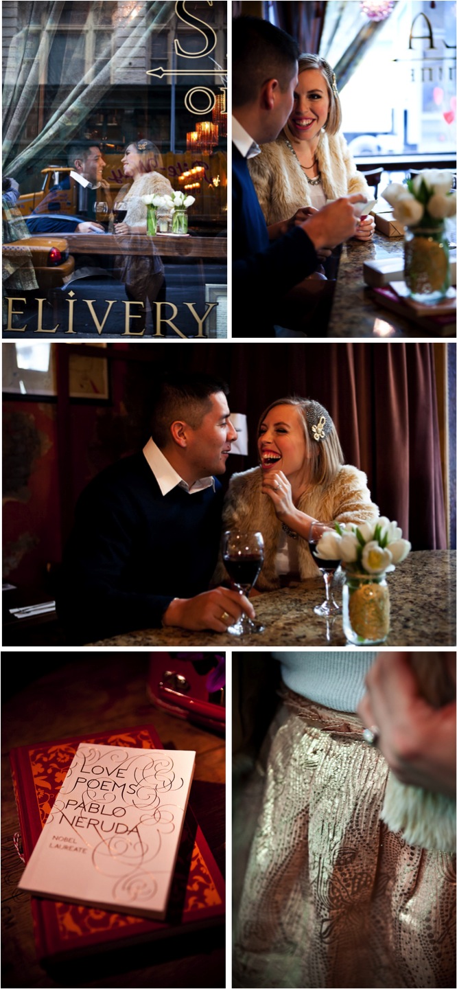 Sala One Nine is a cozy, Spanish tapas-style restaurant nestled on 19th Street and 6th Avenue. Its romantic nooks and crannies make it a perfect Valentine's Day locale. For Suzy and Sergio's e-session, Sofia, Anni and I wanted to show the soft, sexiness of the location, but still make the shoot playful, so Merci stitched up some hand sewn felt hearts and affixed them to striped straws. The centerpiece is equally playful, the poppies stem out of a bright red lunchbox {a little nod to school-house valentines}.